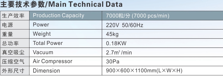 生產(chǎn)效率:膠囊0~42萬(wàn)粒/小時(shí);藥片0~18萬(wàn)片/小時(shí),變頻調(diào)速 · 電壓:220V 50Hz/60Hz · 總功率:0.18KW · 真空吸塵:2.7立方/分 · 壓縮空氣:30Pa · 機(jī)器外形尺寸:900×600×1100mm · 機(jī)器毛重:45Kg · 機(jī)器毛重:60Kg · 產(chǎn)品符合GMP認(rèn)證標(biāo)準(zhǔn) |
